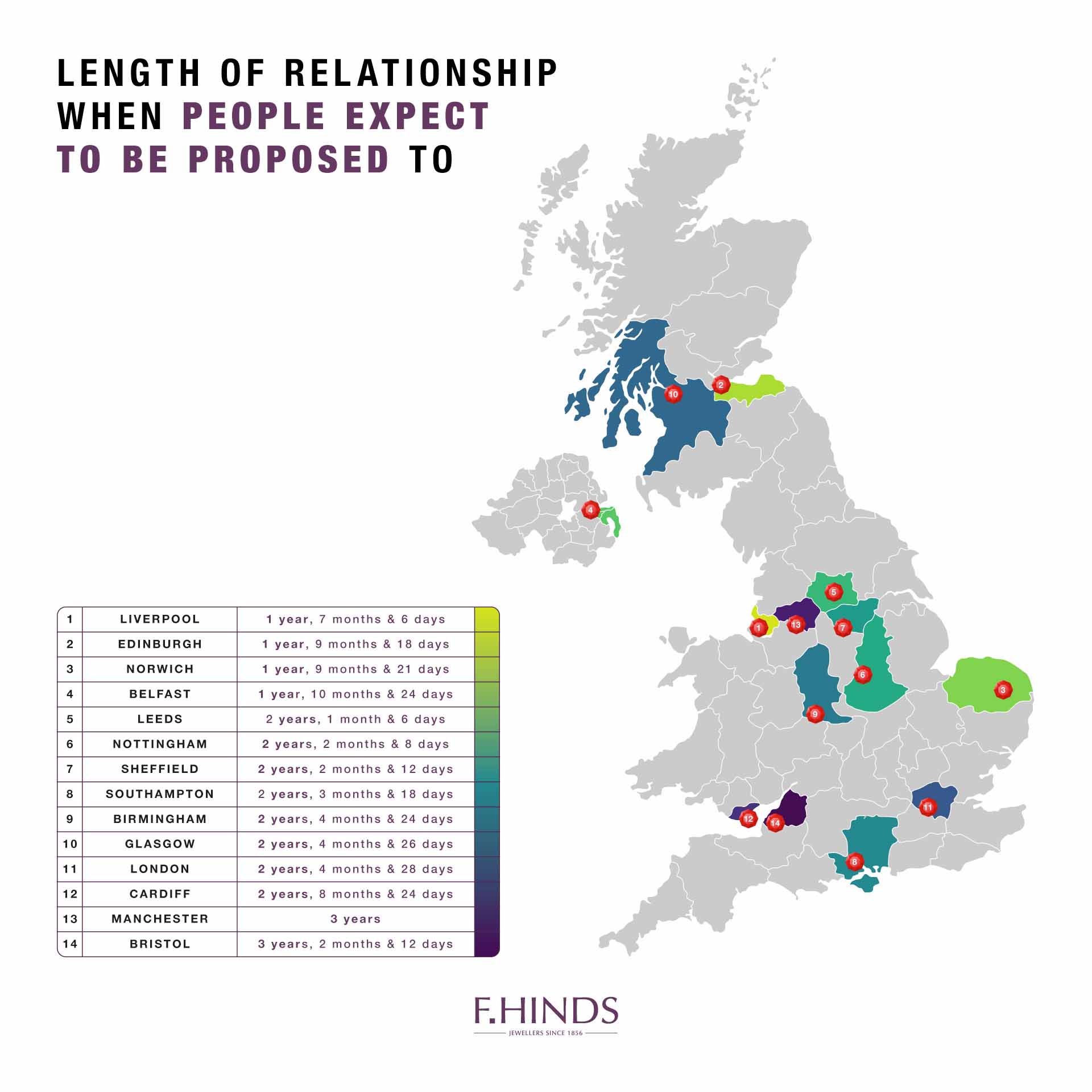 Did the results differ across the country? Yes! Those in Liverpool expect to have a sparkly diamond ring on their finger faster than any other city, wanting to be engaged within 1 year, 7 months and 6 days of starting a relationship.