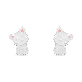 Silver Enamel White Cat Stud Earrings - F0159