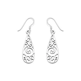 Silver Cut Out Teardrop Hook Wire Earrings - 38mm drop - F0565