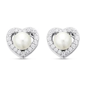 Silver Cubic Zirconia And Simulated Pearl Stud Earrings - 12mm - F11006