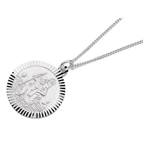 Featuring an emblem of the patron saint of travellers, a St Christopher necklace is said to give protection to its wearers. Our St Christopher medals are inscribed with the traditional translation ‘St. Christopher Protect Us’ and are a powerful talisman to give anyone as a gift. Our St Christopher pendants feature both classic and contemporary designs in gold, silver and steel and are available in both our men’s and women’s ranges.Often depicted with St. Christopher walking across a river with a walking stick while carrying a child, our St. Christopher necklaces are ornate in design and feature both a plain or bevelled edge. Choose a classic medal or circular shape Saint Christopher pendant or opt for a more modern rectangular dog tag style – perfect for the younger man.
