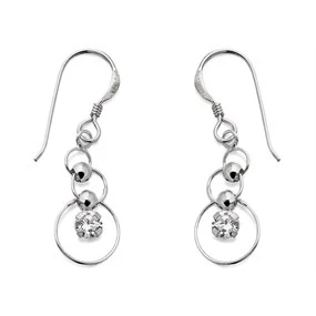 Silver Circles Cubic Zirconia Hook Wire Earrings - 32mm drop - F0830