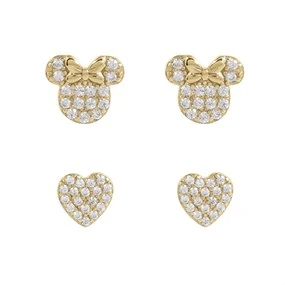 Disney Gold Plated Sterling Silver CZ Minnie And Heart Earrings Set - F67142