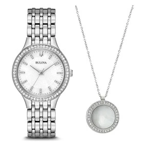 Bulova 96X146 Stainless Steel Crystal Watch And Necklace Gift Set - W83196